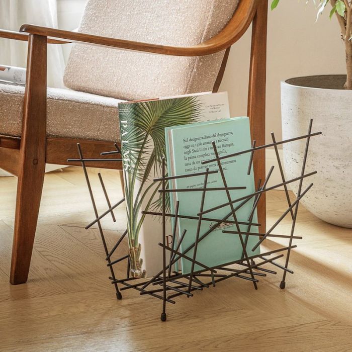 Nonostante l'aspetto destrutturato, ogni singola bacchetta di acciaio inossidabile 18/10 è saldata con precisione millimetrica per garantire stabilità e robustezza. Le forme geometriche irregolari che si creano tra gli interstizi diventano il supporto ideale per accogliere riviste, giornali e libri di grande formato, trasformando un semplice contenitore in una vera e propria scultura da terra.