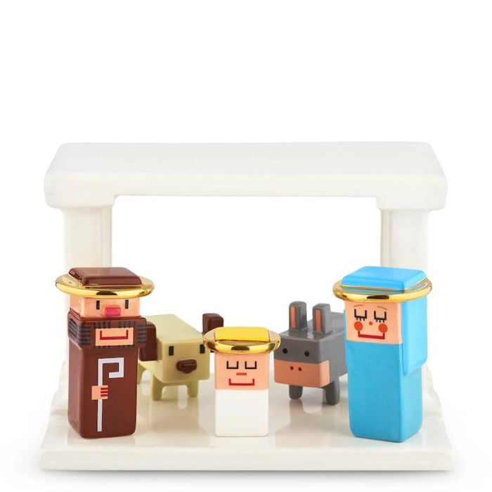 Lontano dalle classiche statuine tondeggianti, "Miracolo!" introduce un linguaggio estetico nuovo che ricorda la visual art dei videogiochi e la pixel art. Le figure sacre — Maria, Giuseppe, il Bambino, il bue e l'asinello — sono scolpite con forme geometriche squadrate e inserite armoniosamente in una capanna altrettanto lineare. Il risultato è un oggetto compatto che fonde l'avanguardia grafica con il calore della tradizione natalizia.