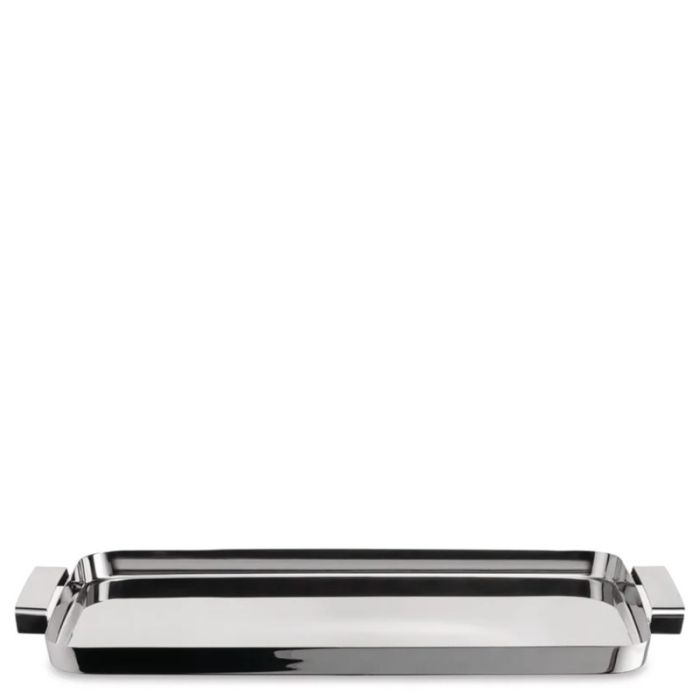 Realizzato in una lastra di acciaio inossidabile 18/10 di alto spessore e lucidato a specchio, il vassoio colpisce per la sua solidità. La superficie rettangolare ampia (quasi 55 cm di lunghezza) permette di trasportare comodamente un intero servizio da tè, caffè o i piatti per una cena formale. I manici, elemento distintivo del progetto, sono disegnati per offrire una presa sicura e confortevole, integrandosi armoniosamente nel profilo dell'oggetto senza interromperne la linearità.