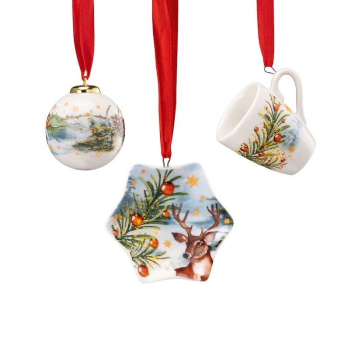 Appendini mini 3 pezzi Hutschenreuther serie Canti di Natale 2023 in porcellana decorata. Set di 3 Decorazioni per albero di natale composte da Tazza Mug, Piatto a Stella e Pallina.