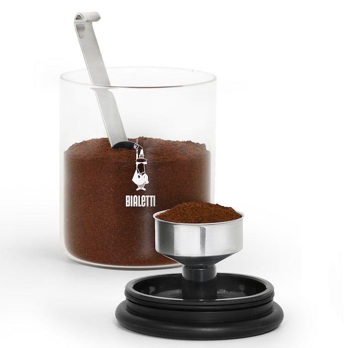Barattolo per caffè Bialetti con cucchiaio dosatore. Sistema pratico per conservare e dosare il caffè senza sprechi. Basta sollevare il tappo, capovolgerlo e poggiarlo su una superficie piana. Posizionare l'imbuto della moka nell'apposito alloggio e con il cucchiaino dosacaffè in dotazione riempire l'imbuto con il caffe macinato senza pressarlo.