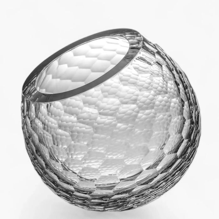 Ciò che rende unico questo vaso è la finitura "Etched" (molata). Dopo essere stato soffiato a bocca dai maestri vetrai, il vetro viene lavorato a freddo (molato a mano) per creare una texture satinata e tattile sulla superficie delle sfere. Questo processo artigianale non solo arricchisce il vaso al tatto, ma crea spettacolari rifrazioni di luce, alternando trasparenze cristalline a zone più opache ed eleganti. Perfetto per ambienti moderni o classici, dona un tocco di lusso discreto e raffinato.