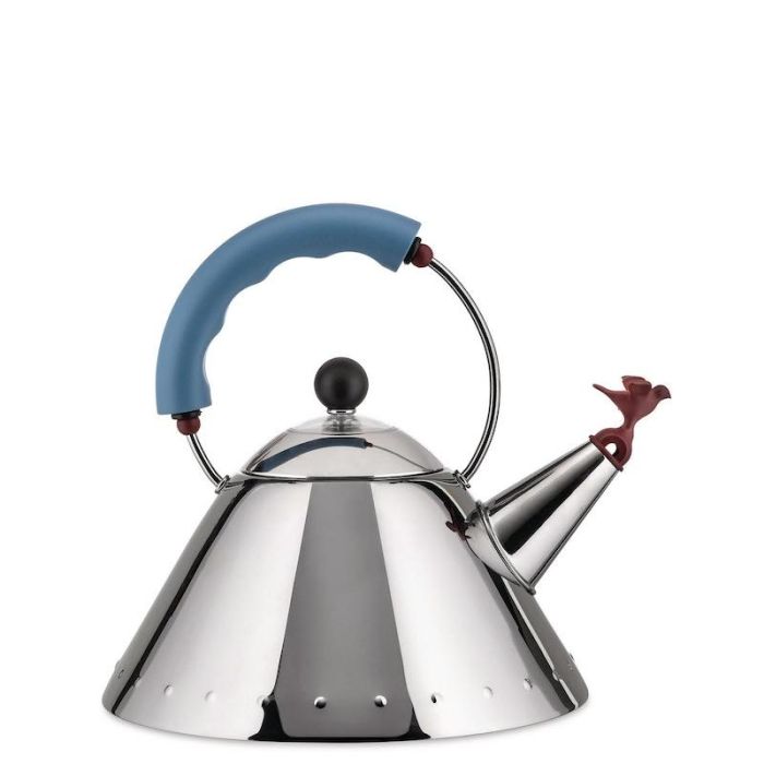 Bollitore con Uccellino ALESSI manico Azzurro. Iconico Bollitore per acqua in acciaio inossidabile lucido adatto a tutte le fonti di calore compreso l'induzione. Made in Italy.