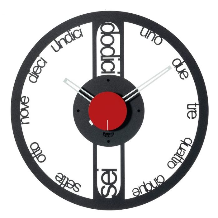 Orologio moderno Arti & Mestieri Circolo piccolo in ferro tagliato a laser color nero. Un elemento decorativo di design che presenta sul quadrante le ore scritte a lettere.