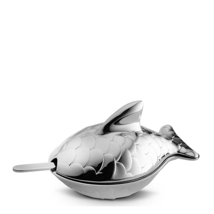 Saliera con cucchiaio e coperchio in acciaio Colombina Fish di Alessi