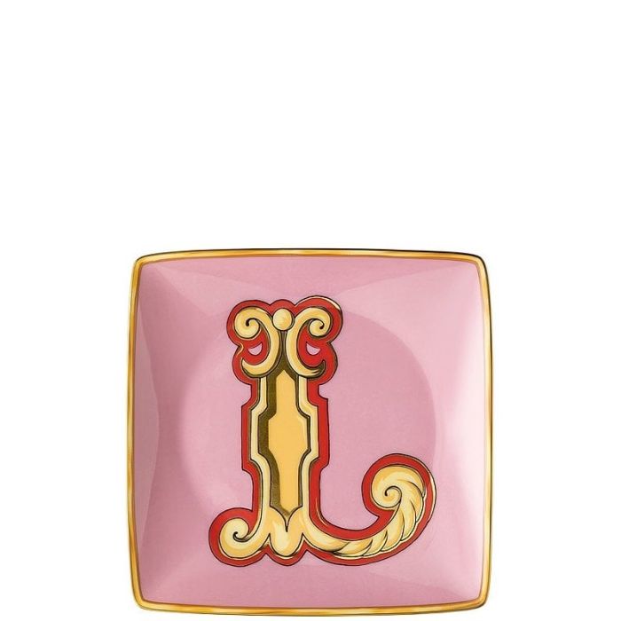 Piattino quadrato rosa Versace lettera L in porcellana Rosenthal. Collezione Alfabeto di Natale
