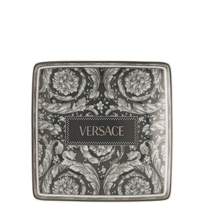 Coppetta quadrata Versace Barocco Barocco in porcellana decorata nei colori Beige, Haze, Teal e Rose. Made in Germany.