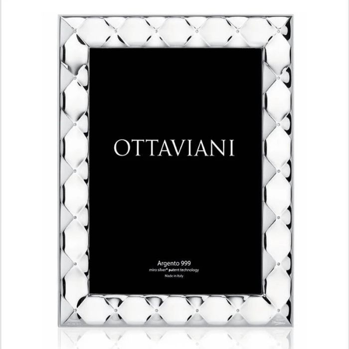 Cornice Portafoto Ottaviani Principessa in metallo argentato (Miro Silver), una esclusiva tecnica di lavorazione dei metalli preziosi. Retro in legno Wengè. Disponibile in varie dimensioni, possibilità di disporlo sia in verticale che in orizzontale.