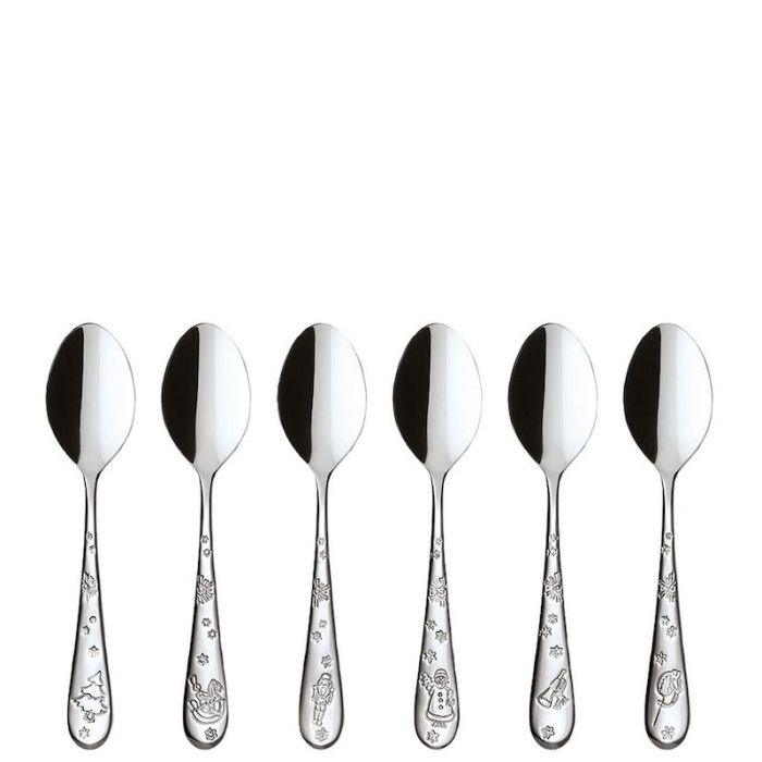 Cucchiaini Caffè Toy's Delight di Villeroy & Boch, set 6 pezzi in acciaio inox lucido con decorazioni natalizie.