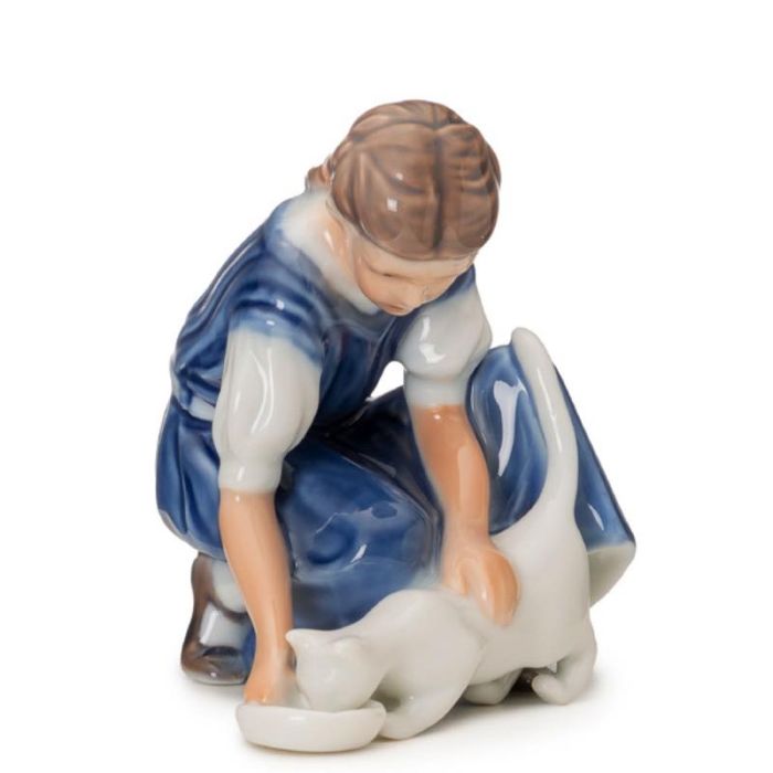 Statuina "Only one Drop" di Royal Copenhagen. Famosissima Ragazza con ciotola e gattino in porcellana dipinta a mano.
