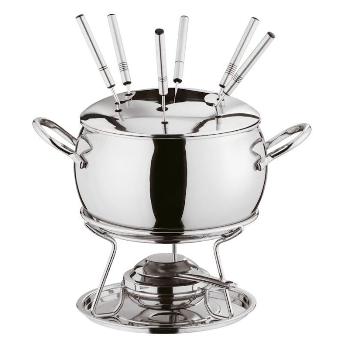 Fonduta Bourguignonne Paderno interamente in acciaio inox. Corredata di bruciatore e 6 forchettine.