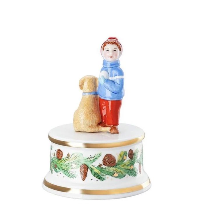 Mentre il cilindro in porcellana ruota, il carillon diffonde le note delicate di "Ihr Kinderlein, kommet" (Venite, bambini), un classico canto natalizio che invita alla meraviglia. Le illustrazioni sulla superficie raccontano scene di "Giochi di Natale": bambini che ridono sulla neve, slittini e pupazzi di neve, il tutto incorniciato da dettagli naturali e colori festosi.