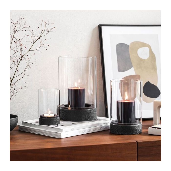 Portacandela Villeroy & Boch Manufacture Rock con base in porcellana nera e cilindro coprivento in vetro. Made in Germany.