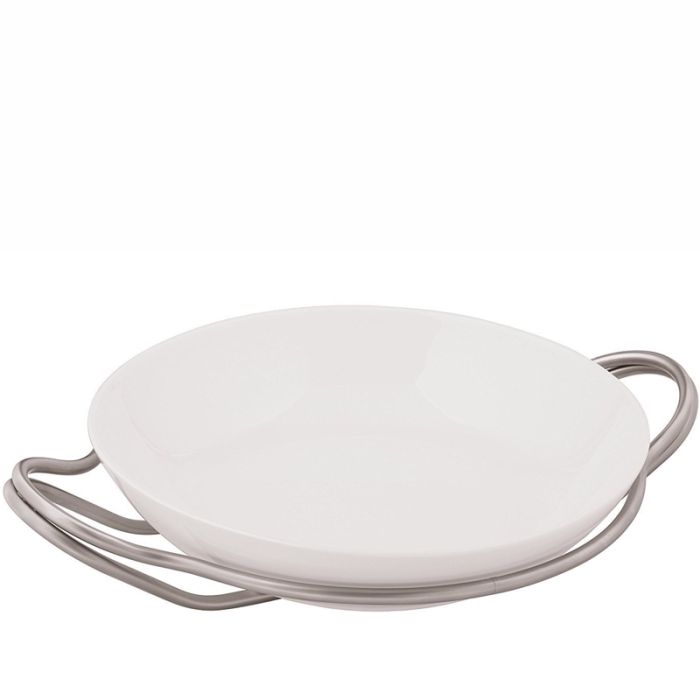 Spaghettiera Sambonet New Living 36 cm in porcellana con supporto in acciaio inox effetto vintage. Utilizzabile come ciotola per servire risotti, pasta o secondi.