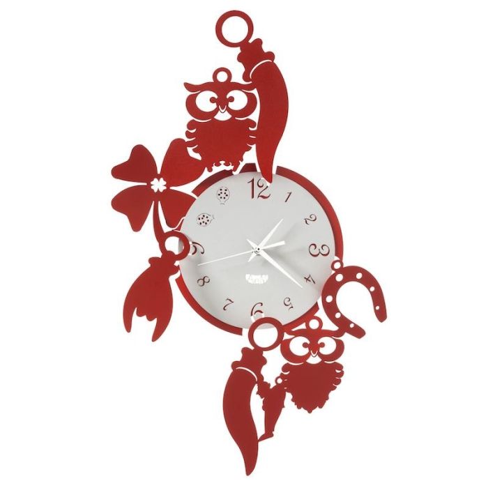 Orologio da Muro Arti & Mestieri Good Luck in ferro colorato, rosso o nero. Un Orologio di Design Moderno con i simboli portafortuna.