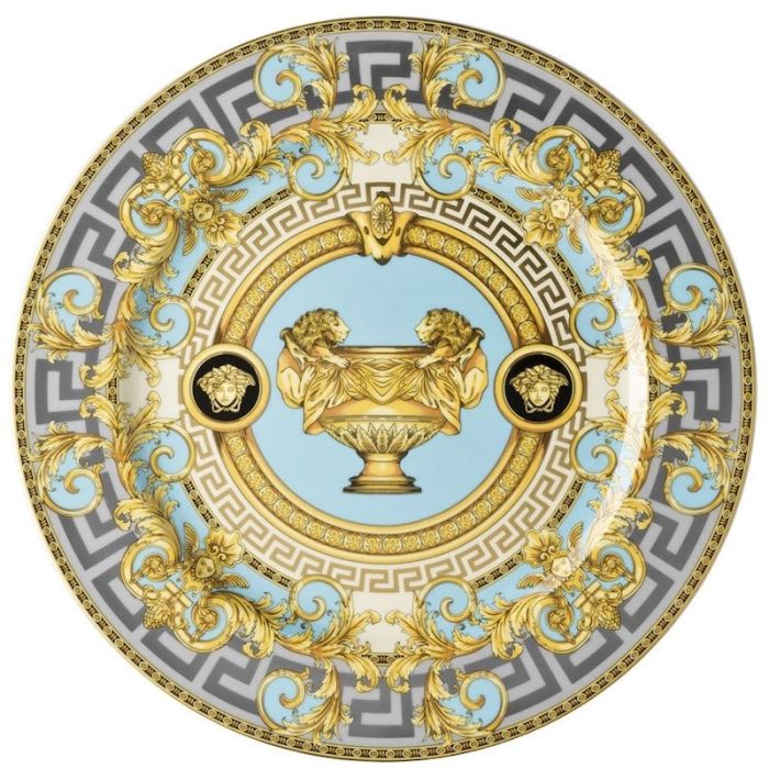 Piatto Segnaposto Versace Prestige Gala Le Bleu in porcellana decorata, fondo azzurro.