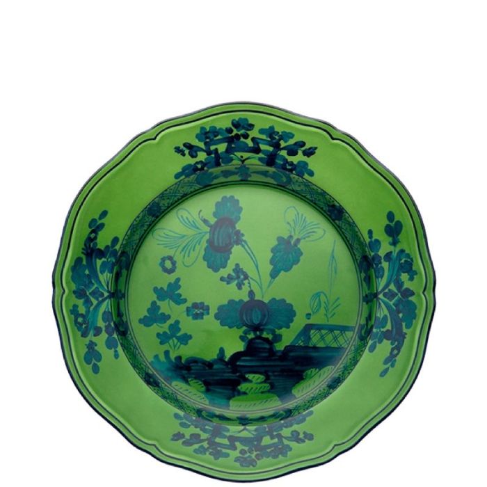 Piatto Frutta Ginori Oriente Italiano in porcellana decorata a mano. Disponibile in 10 colorazioni: Malachite, Cipria, Citrino, Albus, Vermilio, Bario e nei colori Iris, Porpora, Azalea e Pervinca con bordo dorato.