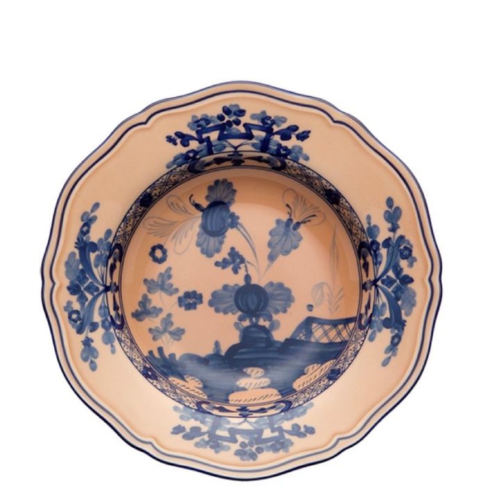 Piatto Fondo Ginori Oriente Italiano in porcellana decorata a mano. Disponibile in 10 colorazioni: Malachite, Cipria, Citrino, Albus, Vermilio, Bario e nei colori Iris, Porpora, Azalea e Pervinca con bordo dorato.