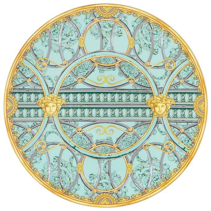 Piatto grande Versace Scala Palazzo Verde in porcellana decorata con metalli preziosi.