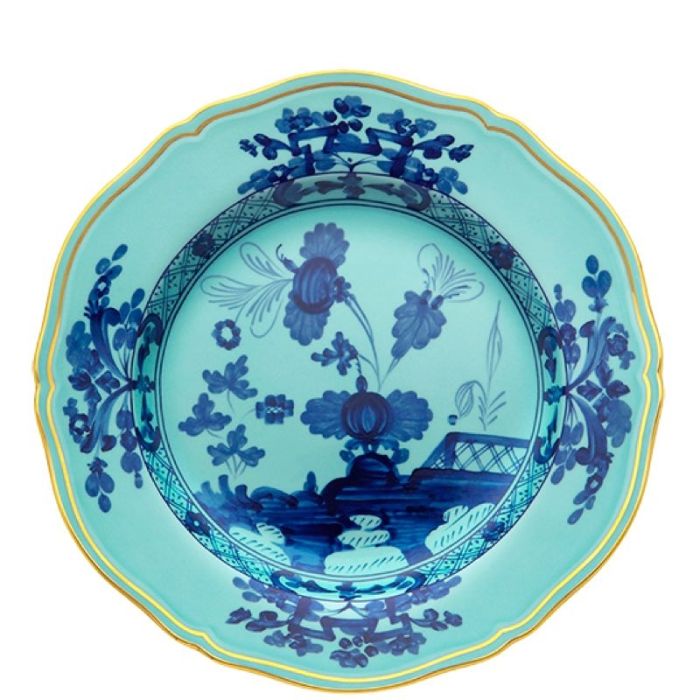 Piatto Piano Ginori Oriente Italiano in porcellana decorata a mano. Disponibile in 10 colorazioni: Malachite, Cipria, Citrino, Albus, Vermilio, Bario e nei colori Iris, Porpora, Azalea e Pervinca con bordo dorato.