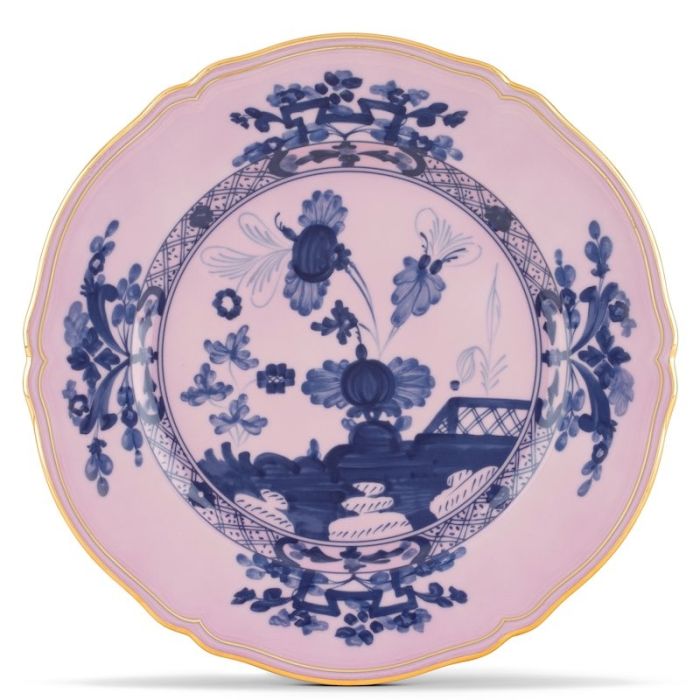 Piatto Presentazione Ginori Oriente Italiano in porcellana decorata a mano. Sottopiatto disponibile in 10 colorazioni: Malachite, Cipria, Citrino, Albus, Vermilio, Bario e nei colori Iris, Porpora, Azalea e Pervinca con bordo dorato.