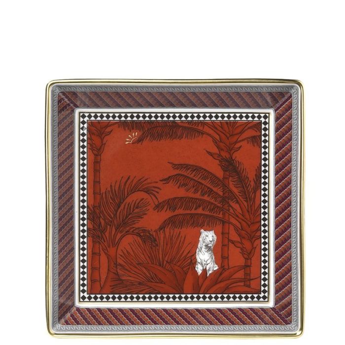 Piatto quadrato svuotatasche Ginori decoro Totem Tigre in porcellana decorata a mano. Made in Italy.