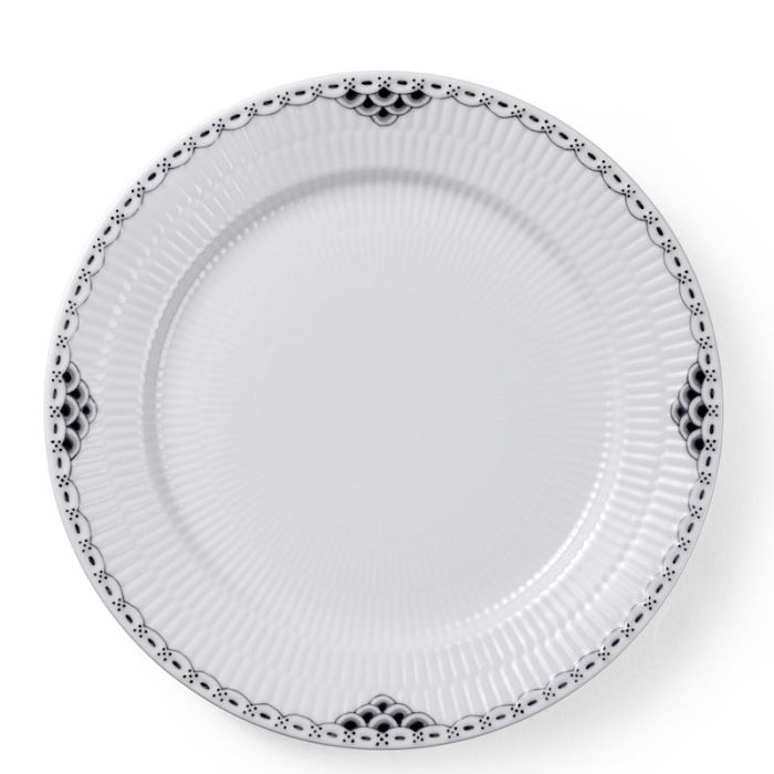 Estetica e Design Come il resto della collezione Black Lace, questo piatto trae ispirazione dalla storica forma "Princess", ma la reinventa per il gusto contemporaneo. La superficie in porcellana bianca presenta la classica scanalatura a rilievo, lasciata volutamente pulita al centro per dare massimo risalto al cibo. L'attenzione è catturata dal bordo: un raffinato motivo a merletto (pizzo) dipinto a mano in un nero intenso, che conferisce carattere e profondità alla tavola.