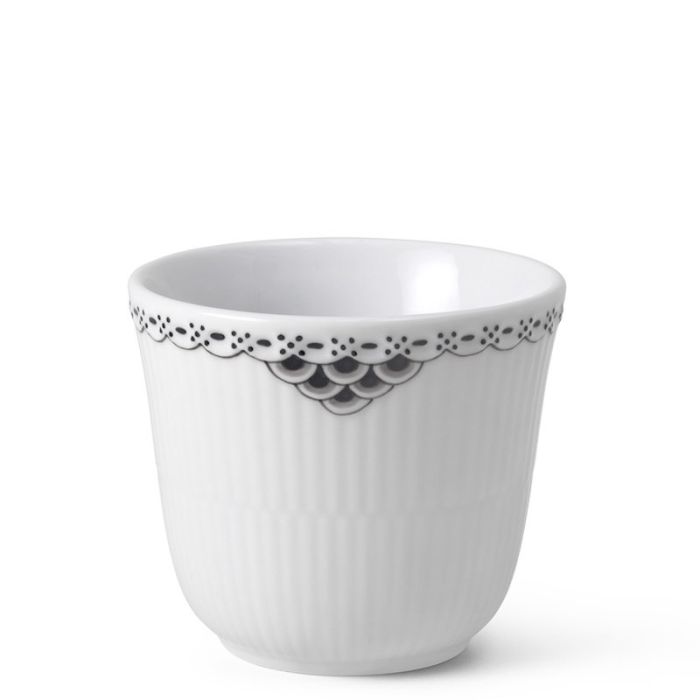L'Estetica Black Lace La superficie esterna riprende la classica scanalatura Fluted, impreziosita sul bordo superiore dal delicato merletto nero dipinto a mano. Un dettaglio che crea un contrasto grafico affascinante con il candore della porcellana, rendendo questa tazza un oggetto d'arredo anche quando non è in uso.