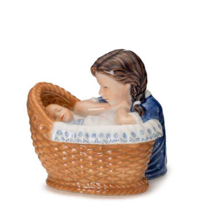 Statuina Ragazza con culla e neonato Royal Copenhagen in porcellana dipinta a mano.