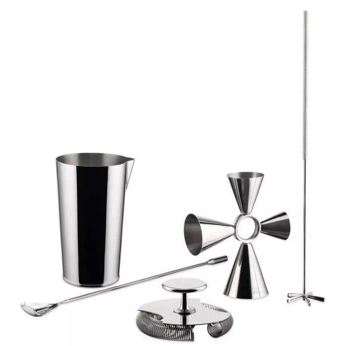 Accessori per Cocktail ALESSI in Gift Box. Un set composto da Carraffa per Mixing, Misurino a 4 capienze, frullino, passino e cucchiaio.