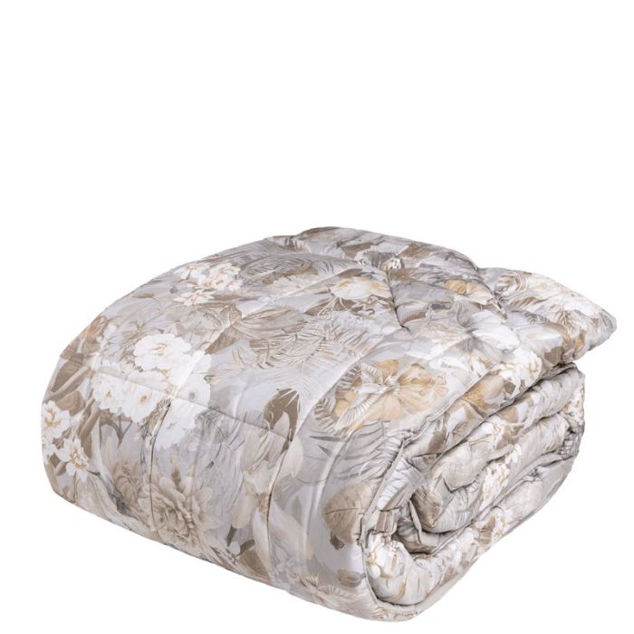 Trapunta Fazzini Protea con preziose stampe digitali in raso 300TC di puro cotone, imbottitura in poliestere. Piumone a capo, rifinito a mano con due angoli sagomati. Ovatta Talko® creata con micro fibre calandrate di bassa denaratura. La calandratura della superficie impedisce il peeling e rallenta la penetrazione dell'aria fredda dall'esterno creando condizioni di benessere ottimali.