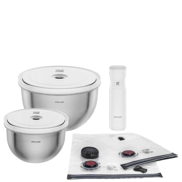 Vacuum Starter set 9 pezzi Zwilling con ciotole in acciaio. Set composto da pompa per sottovuoto, 2 ciotole in acciaio inox 1,75 e 4 litri (18 e 24 cm, altezza 12 e 16 cm), coperchi per sottovuoto abbinati, 2 sacchette S e 2 sacchette M.