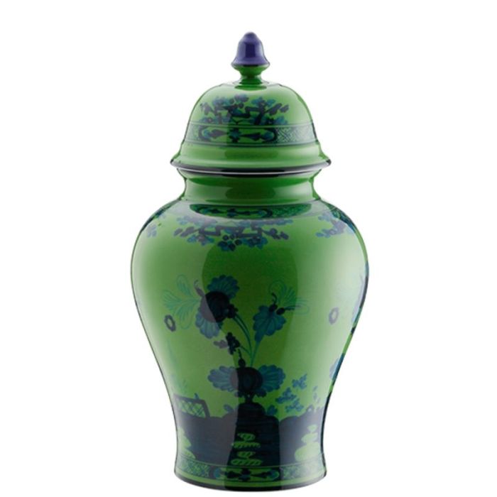 Vaso con coperchio Oriente Italiano in porcellana decorata a mano con metalli preziosi. Potiche disponibile in due misure e in 10 colorazioni: Malachite, Cipria, Citrino, Albus, Vermilio, Bario e nei colori Iris, Porpora, Azalea e Pervinca con bordo dorato.