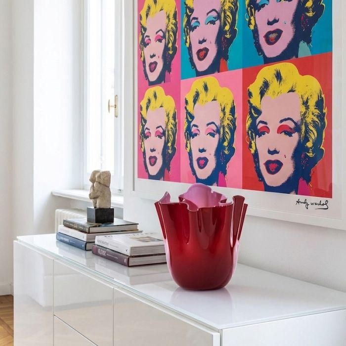 La tecnica utilizzata per questa brillante variante è l'incamiciatura. Sovrapponendo abilmente diversi strati di vetro fuso (il rosso e il rosa), si ottiene una colorazione piena e totalmente coprente. Dall'esterno il vaso si presenta di un rosso vigoroso, ma affacciandosi dall'alto si scopre il cuore rosa, rendendolo perfetto sia come scultura autonoma, sia per accogliere composizioni floreali ricercate.